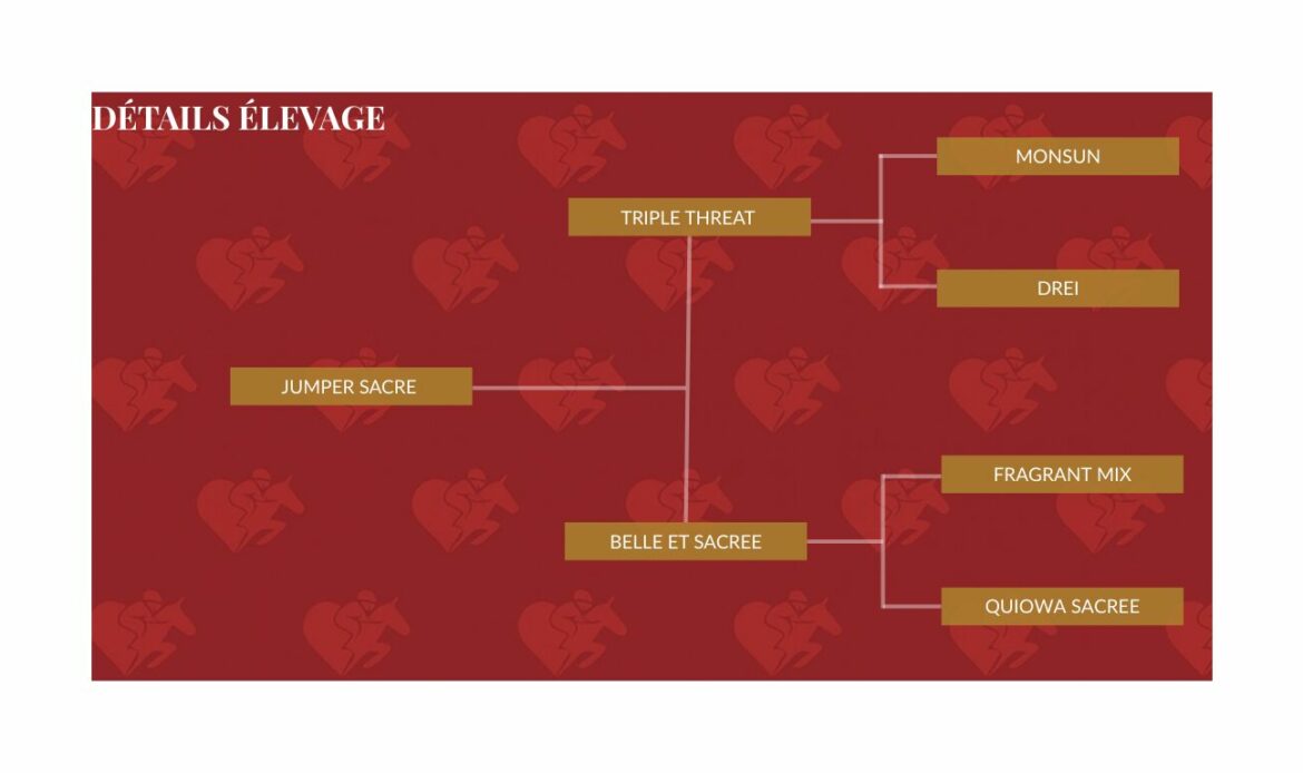 Jumper Sacré est un hongre de 6 ans issu d’un croisement particulièrement soigné, par TRIPLE THREAT et Belle et Sacrée, deux lignées dont la réputation n’est plus à faire dans la production de chevaux d’obstacle sérieux et réguliers.Son père, Triple Threat, transmet à sa descendance de la tenue, de la solidité et un mental appliqué, des qualités essentielles pour performer sur les parcours exigeants. Sa mère, Belle et Sacrée, provient d’une souche reconnue pour sa robustesse et sa capacité à produire des chevaux qui progressent avec l’âge, avec une vraie franchise et une intelligence naturelle de l’effort. De cette lignée maternelle, Jumper Sacré hérite notamment de son sérieux, de sa constance et d’un modèle harmonieux parfaitement adapté à l’obstacle. Ce croisement aboutit à un cheval équilibré, doté d’une belle locomotion, d’un physique bien construit et d’un tempérament volontaire. Dès son plus jeune âge, il a montré les qualités typiques des bonnes origines : facilité d’apprentissage, disponibilité et aptitude évidente à sauter. Jumper Sacré représente ainsi tout ce que l’on attend d’un élevage réfléchi : un cheval né pour performer durablement, avec une base génétique solide et cohérente.