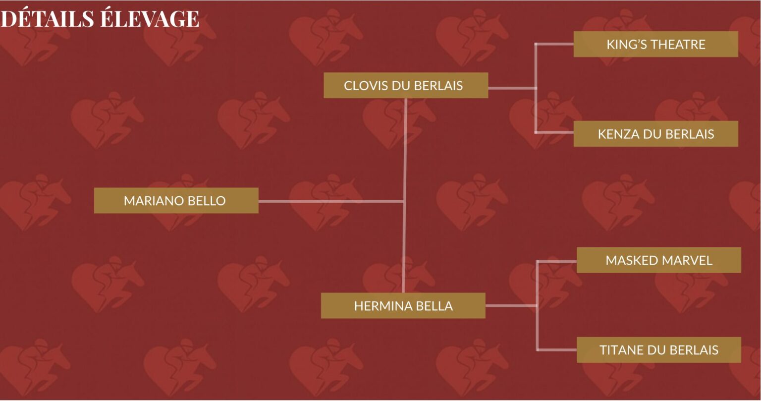 Mariano Bello est issu d’un croisement entièrement orienté obstacle, avec des lignées solides et reconnues pour produire des chevaux durs, sérieux et capables de répéter leurs efforts. Son père, Clovis du Berlais, est l’un des étalons français les plus en vue pour les jeunes sauteurs. Fils du très influent King’s Theatre, il transmet du cadre, de l’énergie et une réelle aptitude à l’effort prolongé — autant de qualités que Mariano Bello semble avoir héritées. Sa mère, Hermina Bella, apporte une touche tout aussi précieuse. Elle est par Masked Marvel, gagnant du St Leger (course prestigieuse) , un étalon reconnu pour donner des chevaux endurants, appliqués et très réguliers en obstacle. La branche maternelle, issue de Titane du Berlais, descend elle aussi d’une famille qui a constamment produit des chevaux sains, et dotés d’un excellent mental, deux points cruciaux pour performer en steeple. Au final, Mariano Bello bénéficie d’une double garantie génétique : un père qui fait ses preuves avec les jeunes sauteurs, et une souche maternelle solide, typée obstacle, connue pour transmettre de la tenue et de la longévité. C’est un pedigree cohérent, construit pour durer et réussir sur les gros obstacles, qui confirme parfaitement les qualités qu’il montre déjà à l’entraînement et dans ses premiers travaux de saut.